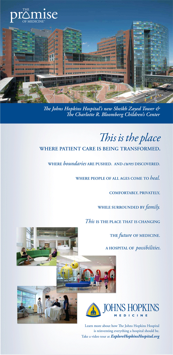The new $1.1 billion state-of-the-art hospital building opened April 29, 2012 at Johns Hopkins Hospital includes the Sheik Zayed Tower and the Charlotte R. Bloomberg Children’s Center, named in honor of the late mother of Mike Bloomberg. The buildings combine art and architecture to create a unique healing environment and elevates the standard of care.