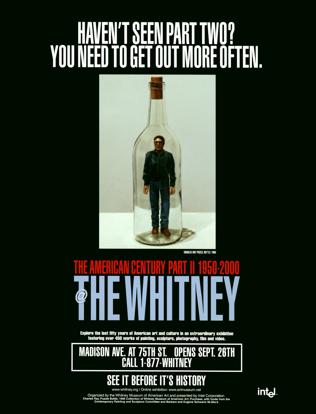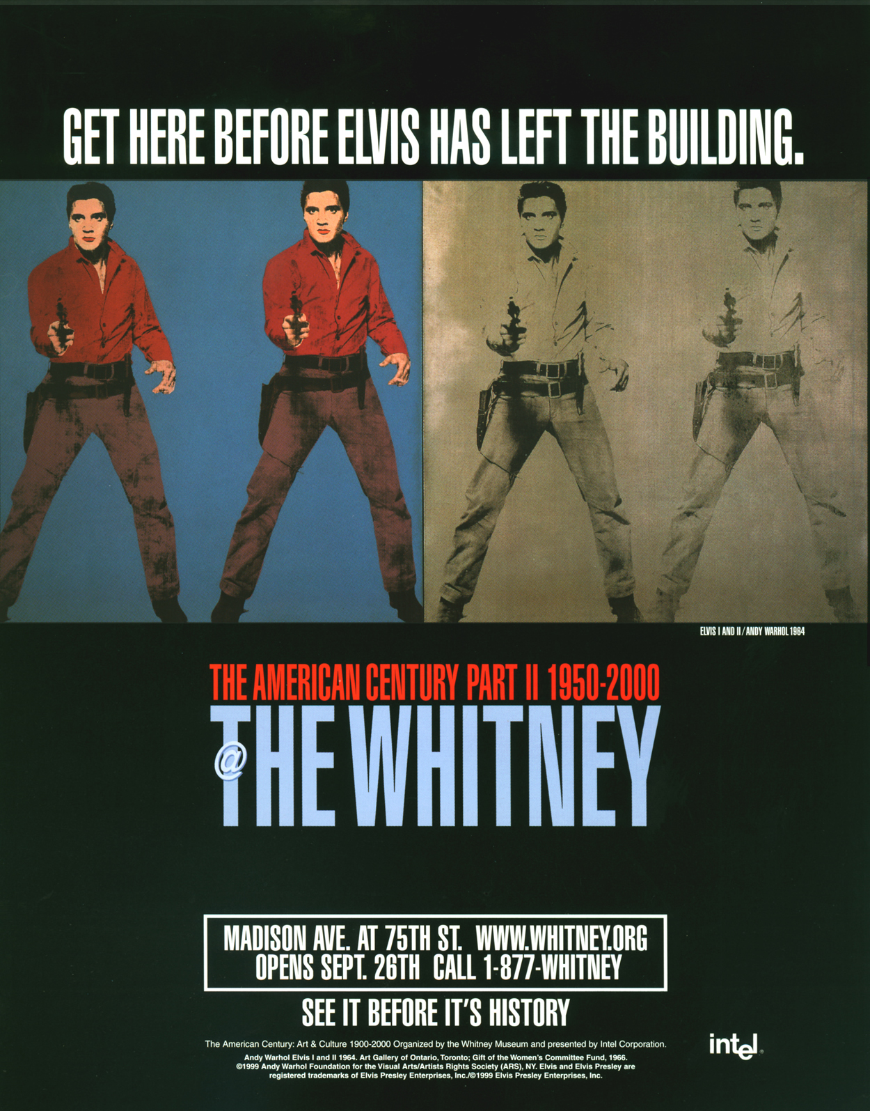 THE WHITNEY MUSEUM OF AMERICAN ART WAS CELEBRATING PART TWO OF THE AMERICAN CENTURY EXHIBITAND NEEDED TO INCREASE ATTENDANCE. WE WERE TASKED WITH PITCHING THE BUSINESS WITH THAT IN MIND. WE CAME UP WITH THE LINE "SEE IT BEFORE IT'S HISTORY" WHICH UNDERSCORED THE URGENCY OF THE CULTURAL EVENT. USING POP ARTISTS AND THEIR MASTERPIECES TO VISUALLY ARREST CONSUMERS, AND A DECIDELY MORE APPROACHABLE TONE OF VOICE, WE WON THE ACCOUNT AND PACKED THE EXHIBIT TO THE WALLS.