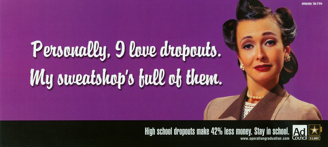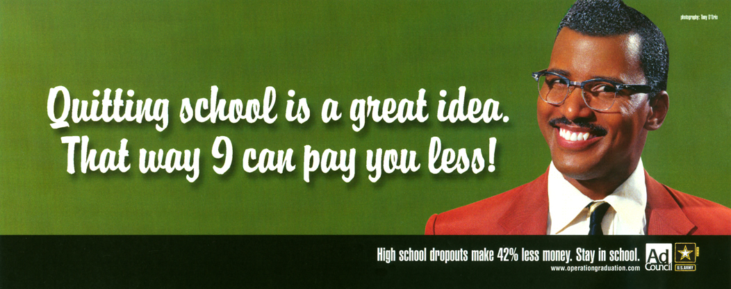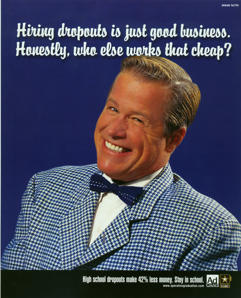 Banner ads and outdoor aimed at troubled teens thinking of dropping out of high school, the "Tough Bosses" campaign focused attention on how little financial leverage high school dropouts have, and the fact that they make 42% less than graduates do. A joint effort on the part of The Ad Council and The US ARMY, that talked to both teens and their parents. This was just part one in a two pronged campaign, that also included a more parent focused component. The parent focused work was entitled "Don't Drop Out On Your Kids" and sought to encourage parents to get more involved in their child's education.